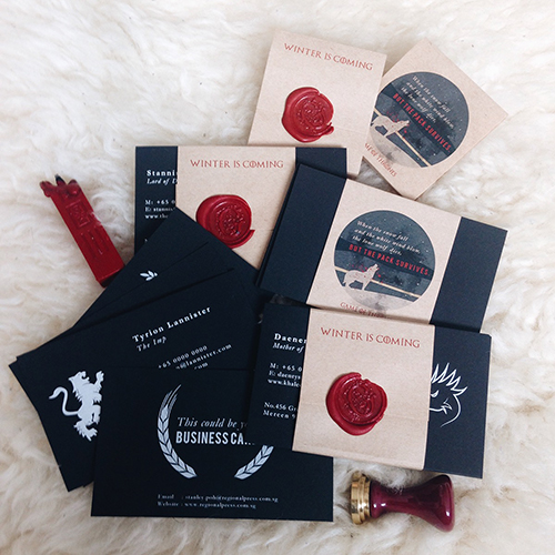 Being a huge fan of Game of Thrones, we came up with a set of business cards incorporating some of the character’s names and creating a logo for each characters to make it look like a “real” business card, with the use of our white toner, it helped give the cards a more elegant feel.